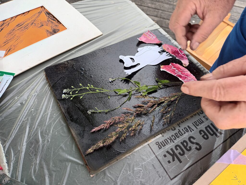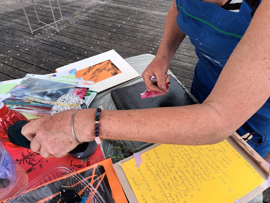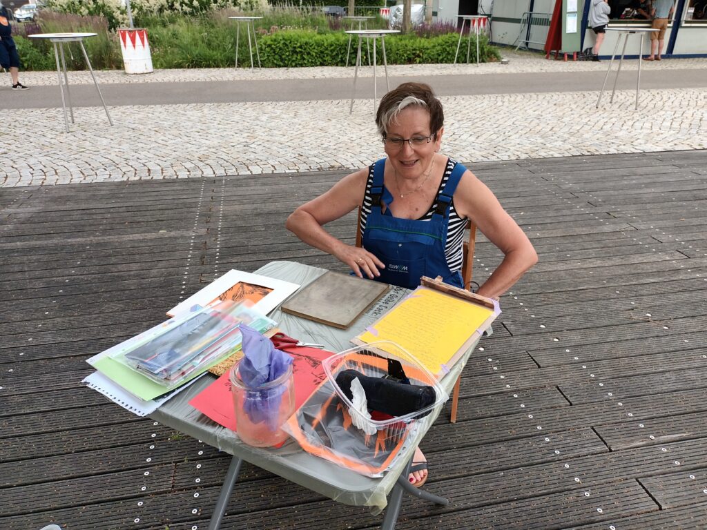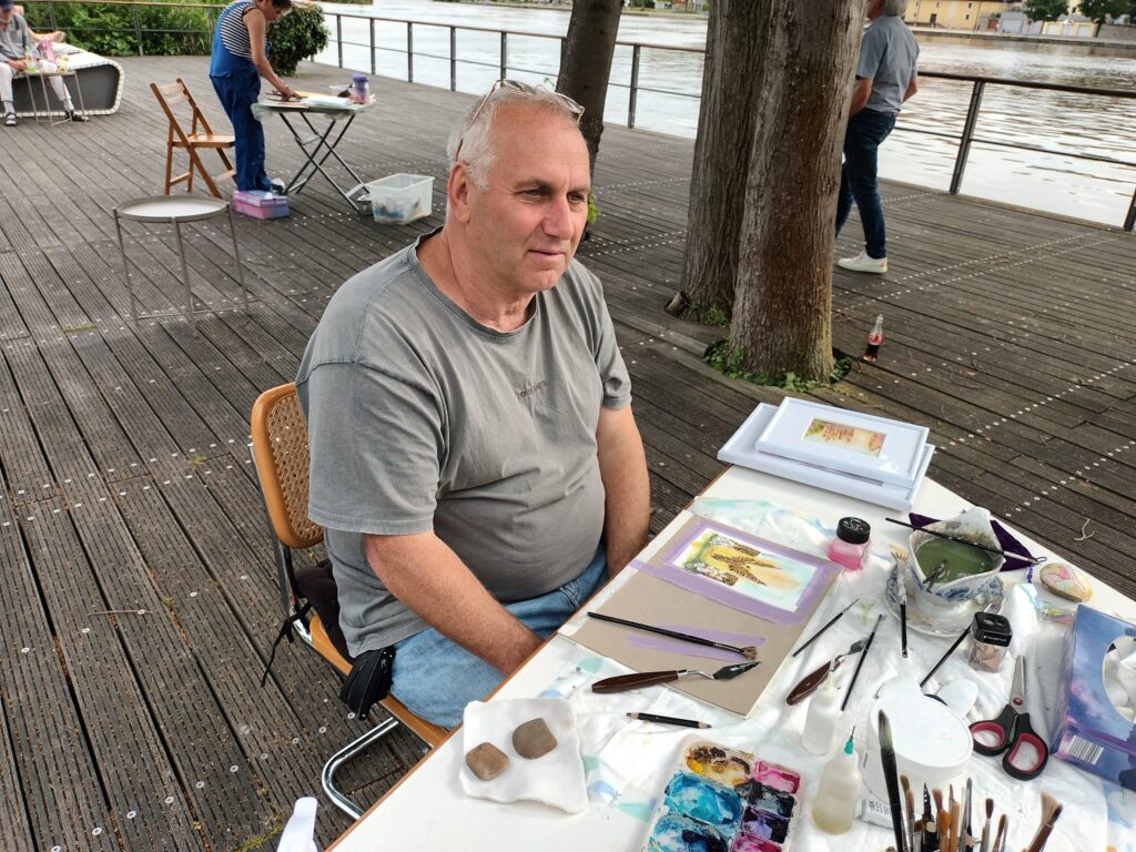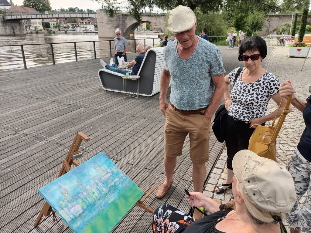 Am Samstag trafen sich sieben Kunstschaffende am Stadtbalkon in Kitzingen, um die Entstehung ihrer Kunstwerke zu präsentieren. Die Künstler nutzten eine breite Palette verschiedener Techniken und Materialien, darunter Kreide, Acryl, Druckplatten und geplättetes Messing, die sie auf Leinwände und andere Untergründe brachten.